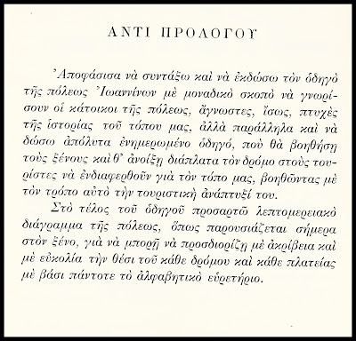 Επιθυμία και αρχή μου να μοιράζομαι όλα αυτά με φίλους ... γνωστούς και άγνωστους.... Κάθησα,λοιπόν,και αντέγραψα τον "οδηγό" και εύχομαι να ευχαριστηθούν και να θυμηθούν οι συνομήλικοί μου ... οι παλιοί Γιαννώτες , αλλά και οι νεώτεροι αυτοί που αγαπούν και θέλουν να μαθαίνουν για τα παλιά Γιάννινα.